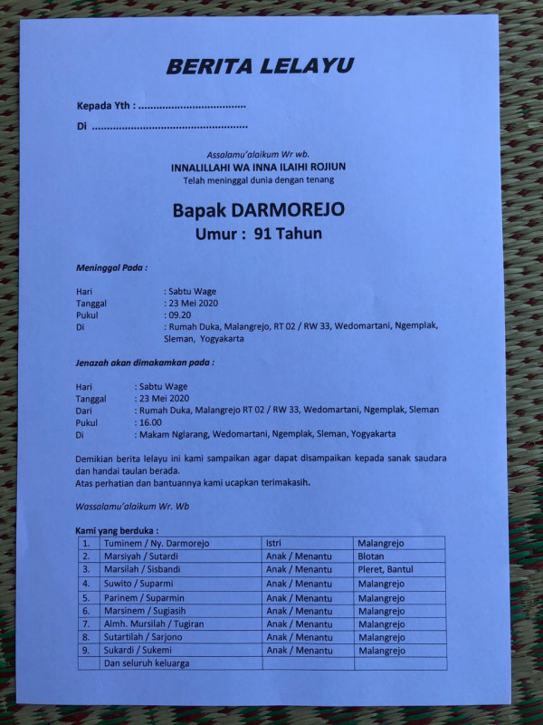 Kegiatan dilakukan dengan mengumpulkan beras 1 kg untuk setiap kepala keluarga. Kegiatan ini bertujuan untuk meringankan beban anggota keluarga yang berduka dan bentuk gotong royong, guyup rukun warga yang patut kita lestarikan.