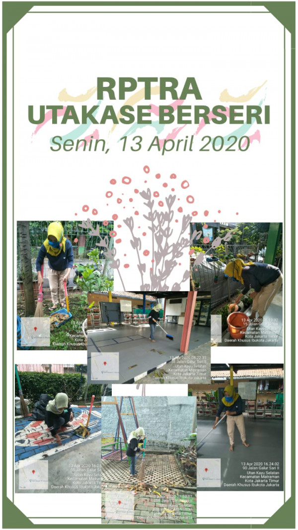 Berada dalam situasi tanggap darurat bencana virus corona (COVID-19) tidak menghentikan semangat para pengelola RPTRA di wilayah Kelurahan Utan Kayu Selatan. Sesuai arahan pengurus, para pengelola RPTRA diharuskan WFH (Work From Home) karena RPTRA ditutup untuk sementara waktu sampai waktu yang ditentukan nanti. Setiap harinya ada piket dan monitoring oleh para pengelola RPTRA. Hal ini bertujuan agar RPTRA tetap terjaga kebersihan dan keindahannya walau dalam keadaan pandemi virus corona (COVID-19).Kegiatan yang biasa dilakukan oleh para pengelola RPRA yaitu :