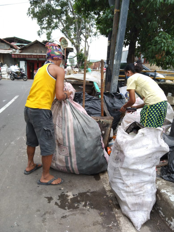 menindak pemulung memilah sampah di pinggir kali kelurahan Utan Kayu Selatan