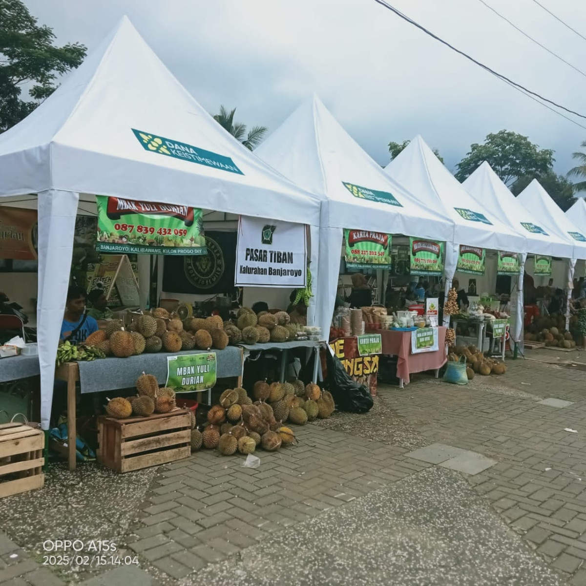 Terdapat 10 tenda yang berjejer untuk memasarkan buah durian dan 2 tenda besar untuk produk-produk dari KWT se Kalibawang. Ada juga stand Dinas Pertanian dan Pangan untuk mendisplay buah-buahan lokal yang dibagikan gratis kepada masyarakat.