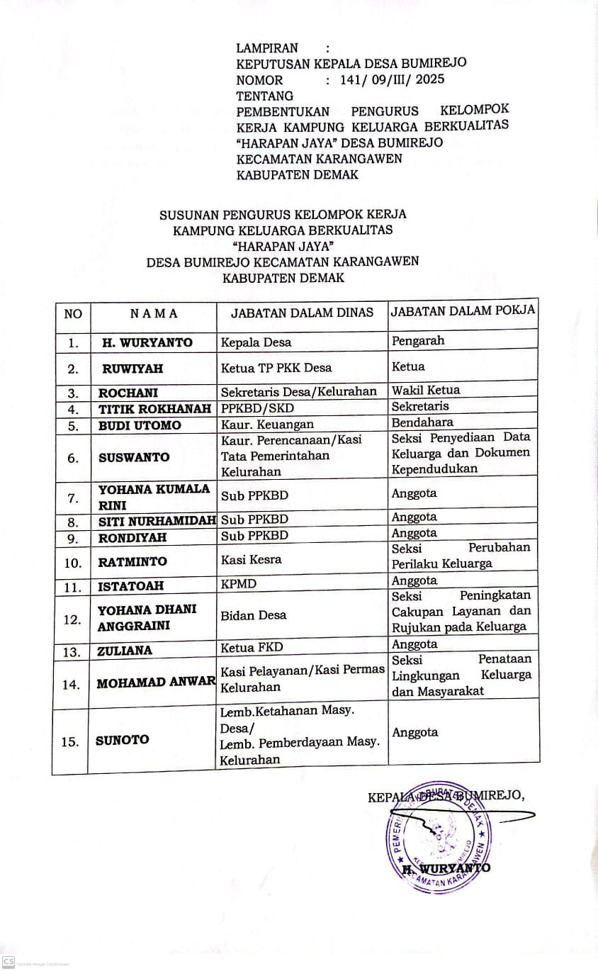 1. Terbentuknya kepengurusan Kampung KB yang dikukukan dalam Surat Keputusan (SK)