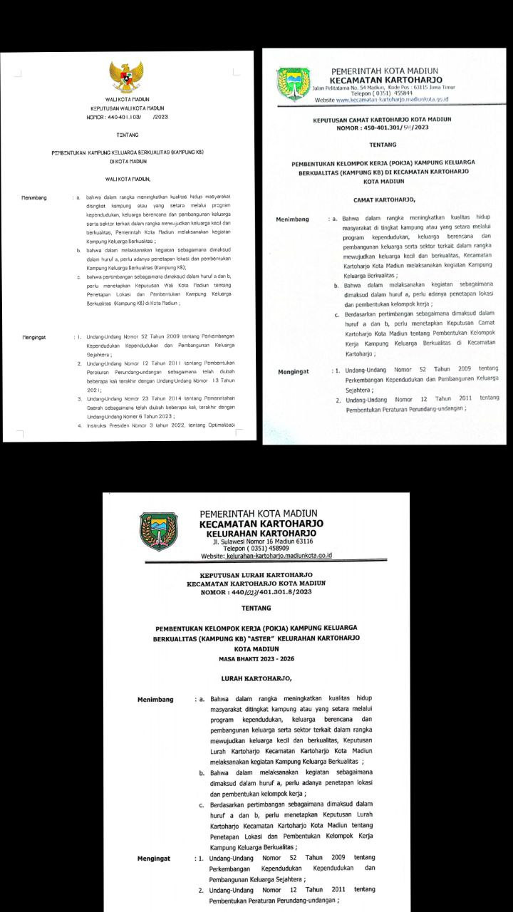 Surat Keputusan/Instruksi/Surat Edaran dari Bupati/Walikota SK Kecamatan tentang Kampung KB SK Kepala Desa/Lurah tentang Kampung KB |