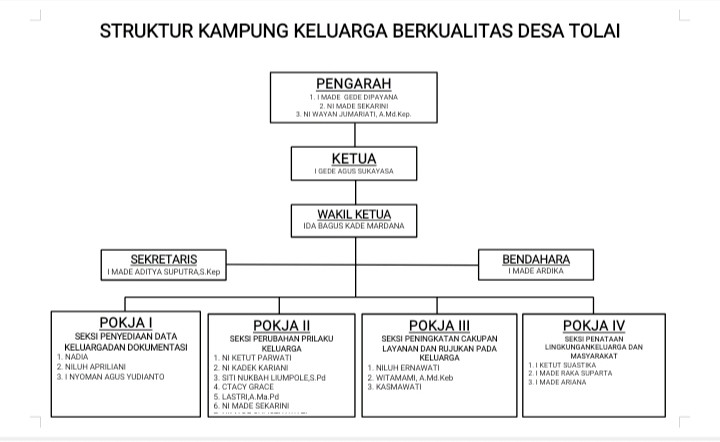 Desa tolai memiliki jumlah pus sbnyak 1059 Diantara 1059 ini ada akseptor aktif 615 dan bukan peserta KB 444 Akseptor aktif rincianx sbb: Pil 164, Suntik 156, Implan 55, Iud 90, Kondom 11, Mow 138 Dan Mop 1
