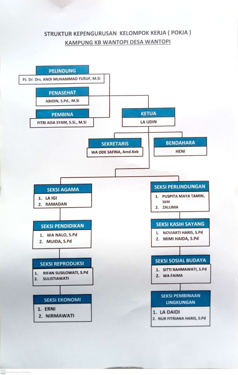 Camat FITRI AISA SYAM, S.SI., M.Si segera membentuk dan mengukuhkan Pokja Kampung KB Tingkat KECAMATAN dan Kampung KB Wantopi . Kepala Desa Wantopi segera membuatkan SK Kepala Desa No. 31 Tahun 2023, Tanggal 29 Mei 2023 tentang Kelompok Kerja Kampung KB Desa Wantopi