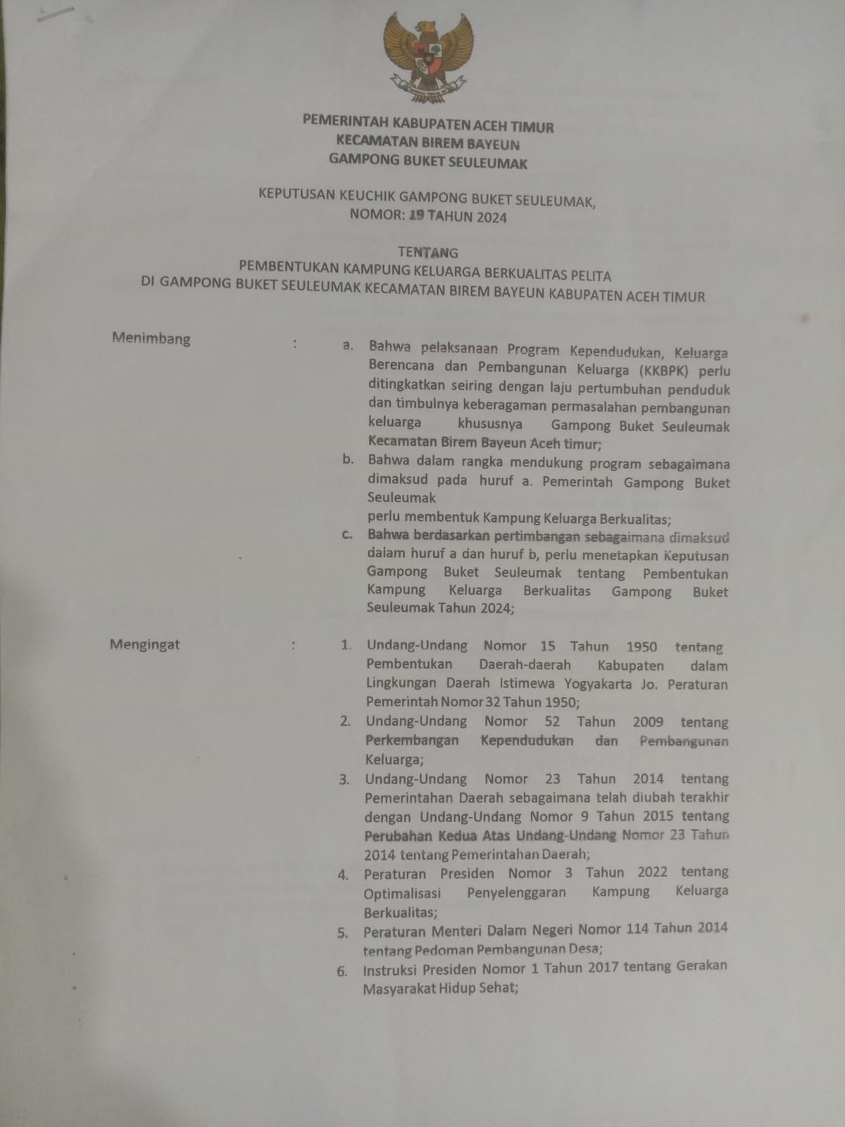 Surat Keputusan/Instruksi/Surat Edaran dari Bupati/Walikota SK Kepala Desa/Lurah tentang Kampung KB |