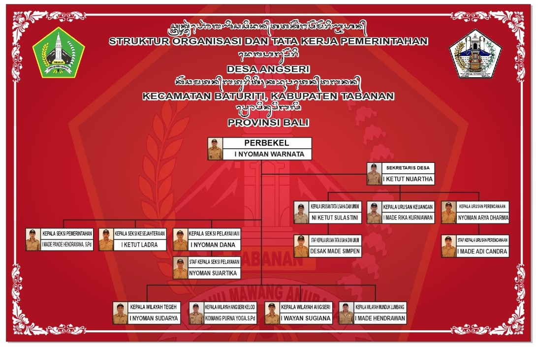 Adapun luas wilayah Desa Angseri yaitu 758.160 Ha yang secara administratif terbagi atas 4 Banjar Dinas atau Dusun yaitu Banjar Dinas Tegeh, Banjar Dinas Angseri, Banjar Dinas Angseri Kelod, dan Banjar Dinas Munduk Lumbang.